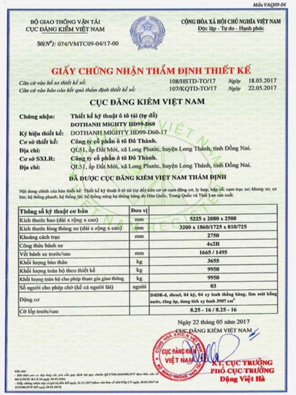+ Các bản vẽ kỹ thuật quy định của xe (bản chính).